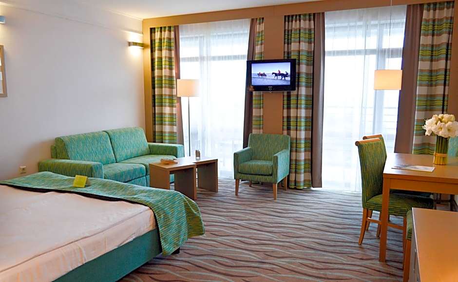 Beside the sea, a private beach area awaits with umbrellas and chairs ready to shade sun-drenched days, while the indoor and outdoor pools promise splashes of fun and a playful waterslide adds whimsy. After a day under the Bulgarian sun, a sauna and terrace provide a relaxing pause. Families will appreciate a free kids' club, a kids' pool, and kids' meals, while grown-ups can savor the on-site restaurant and bar, plus free WiFi, a free fitness center, and a 24-hour front desk. For those seeking bigger adventures, water sports on site, a water park, spa or wellness packages, meeting/banquet facilities, and parking are available for extra charges.