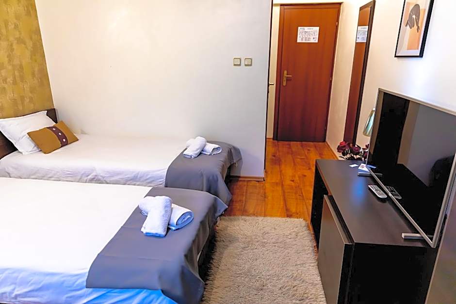 The Velinov Boutique Hotel offers a variety of rooms including Deluxe Double Rooms, Standard Double or Twin Rooms, Duplex Apartments, Single Rooms, Budget Triple Rooms, Apartments with Mountain Views, Two-Bedroom Apartments, and Junior Suites. Smoking is not allowed in any of the rooms. The rooms vary in size, with the smallest room being 129 sqft and the largest room being 635 sqft. Occupancy ranges from single rooms accommodating 1 adult to two-bedroom apartments accommodating 5 adults and 2 children. Bed sizes include Queen size beds, Twin beds, and Sofa beds.