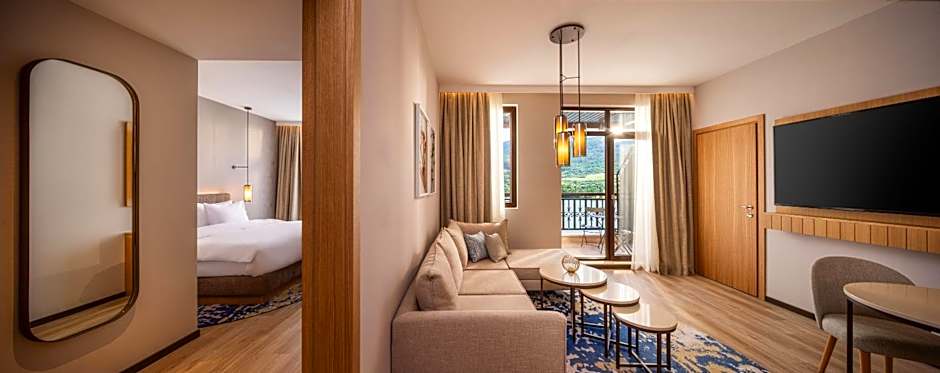 A cozy suite featuring a comfortable king bed, dedicated workspace, sofa and balcony. Guests can stay connected with complimentary Wi-Fi and enjoy the stunning view over the beautiful Balkan Mountains.