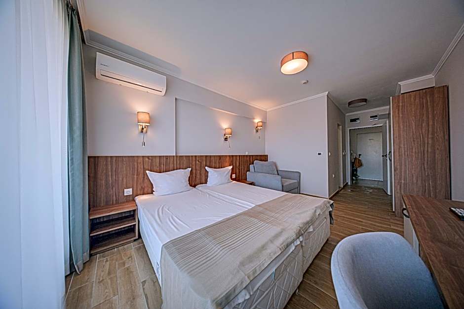 Very nice Hotel, next to Primorsko center, a walk distance to south beach and a lovely park in front. Friendly staff, big and clean room. Delicious food and rooftop pool with 360 view of all town and the beach too.