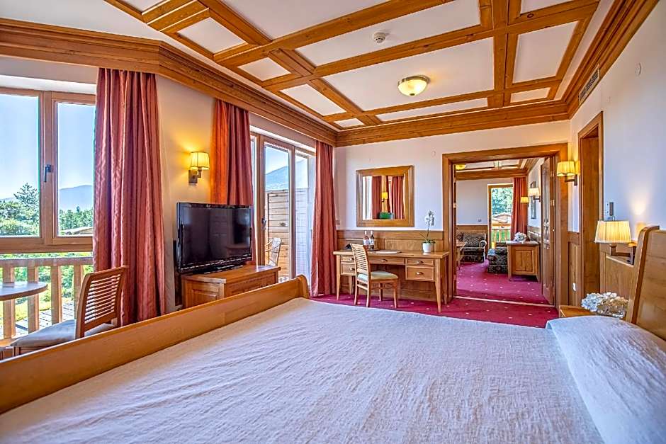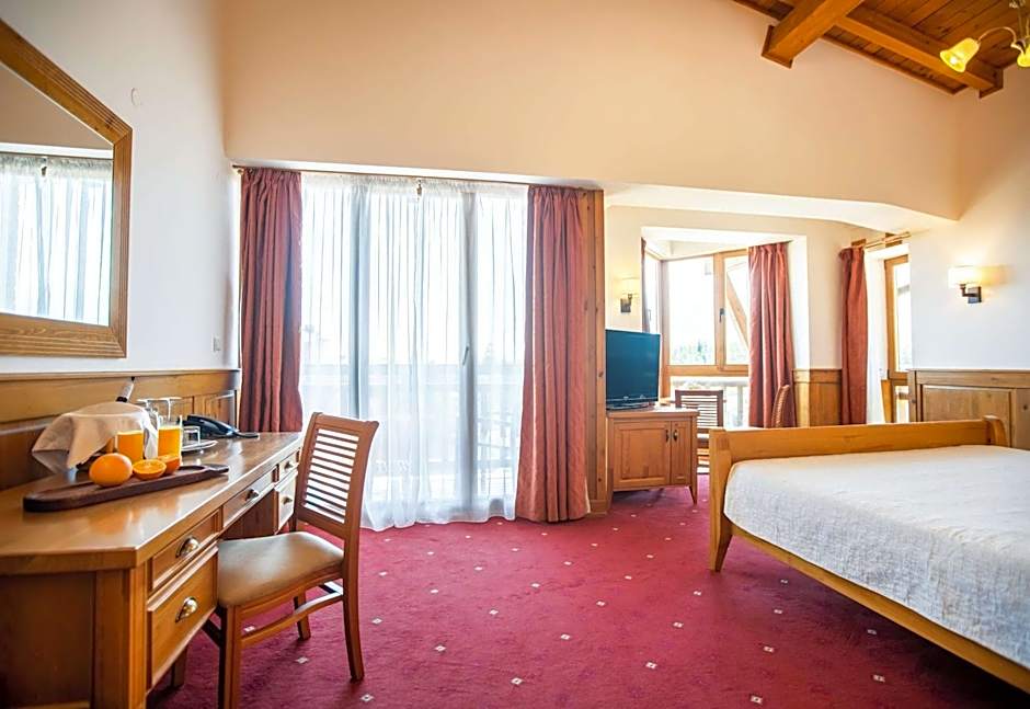 Bright and spacious suite consisting of a bedroom and a living room with a seating area. Plasma TV, a mini-bar and a kettle are also available. Luxurious bathroom with a bathtub, a bidet and complimentary luxury cosmetics are provided. The balcony offers a view of the golf complex and Pirin Mountain.