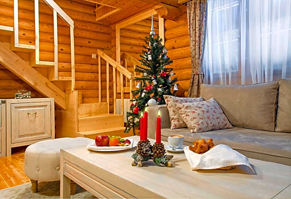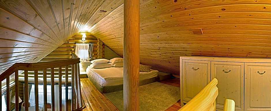 The villa has 2 floors, made entirely from whole wood beams and include a Finnish sauna. They offer a king-size bed on each floor, a porch with a table and 2 chairs, 1 armchair, a Smart TV and a parking space next to the villa.