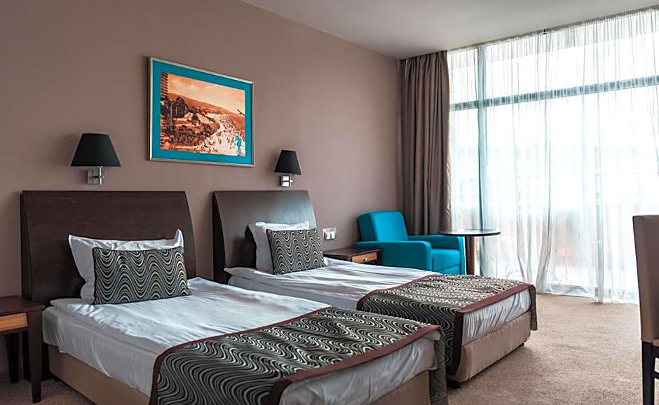 Nestled in the picturesque Golden Sands Resort in Varna, Bulgaria, the 4-star offers a luxurious seaside retreat just a stone's throw away from the city center. With a private beach area and beachfront access, guests can unwind with ease while soaking up the sun or taking a refreshing dip in the outdoor or indoor swimming pools. The hotel's top-notch amenities cater to both relaxation and recreation, including a spa offering wellness packages, a kids' club, a fitness center, and even a sauna and steam room for unwinding after a day of exploring the city.