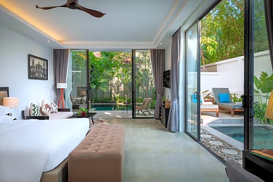 The modern Khmer-style units are well-furnished, featuring Wi-Fi access and flat-screen TV. Private balconies have outdoor seating, with views of the pool or surrounding greenery. Room service is available until 9pm.