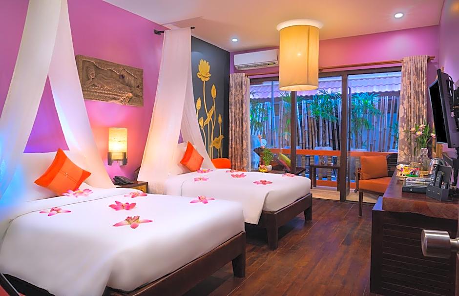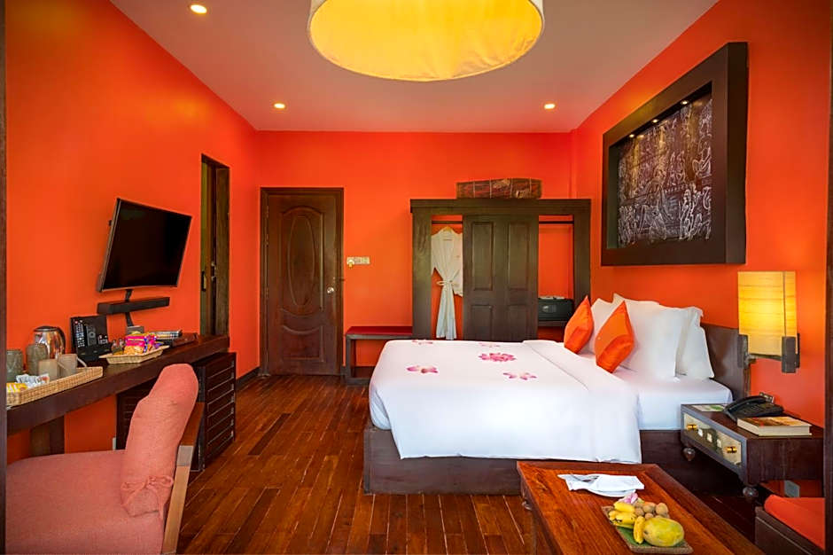 Our Superior Twin Rooms are located on the first and second floors of the hotel, offering a comfortable and stylish retreat. Each room features twin beds, a spacious attached bathroom, and a separate seating area, providing plenty of space to relax. The décor showcases beautiful traditional Cambodian art and handicrafts, creating an authentic and inviting atmosphere. Modern amenities include free Wi-Fi and flat-screen smart TVs with a wide selection of international channels, ensuring both comfort and entertainment during your stay.