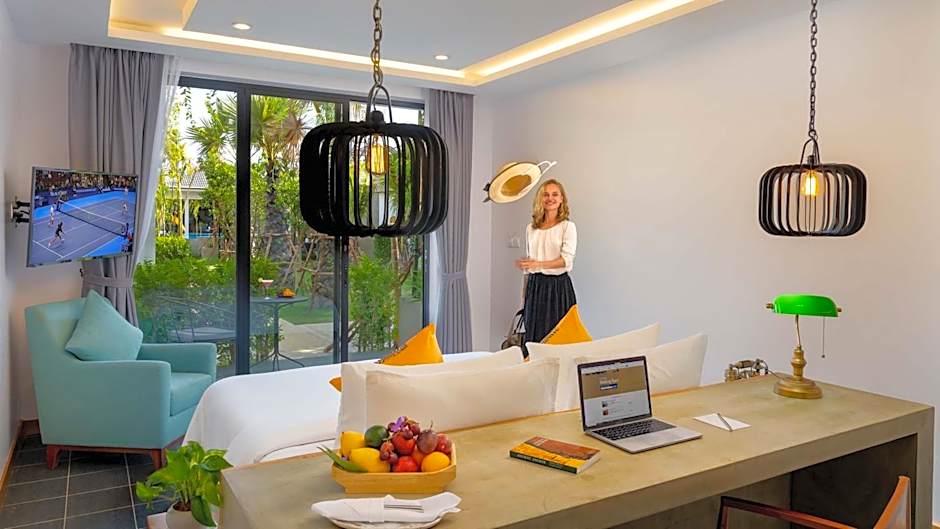 This double room features a balcony, pool view and air conditioning. It also has a private patio daybed.
