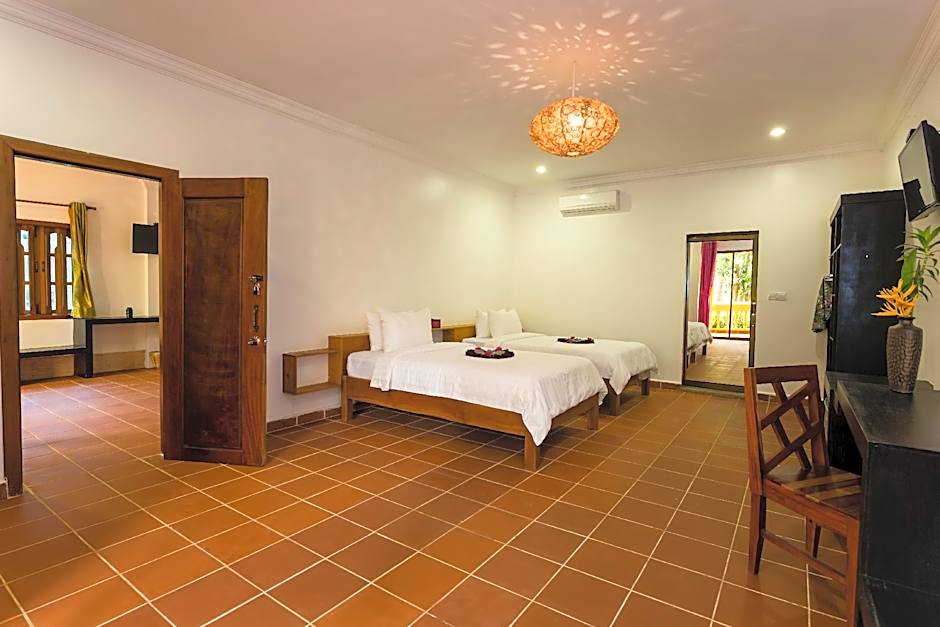 Le Jardin d'Angkor Hotel & Resort offers Triple Rooms and Interconnecting Rooms. The Triple Rooms have a room size of 484 sqft and can accommodate 3 adults on a Twin bed and a Queen size bed, with no smoking allowed. The Interconnecting Rooms have a larger room size of 969 sqft and can accommodate 4 adults on 2 Twin beds and a Queen size bed, with no smoking allowed.