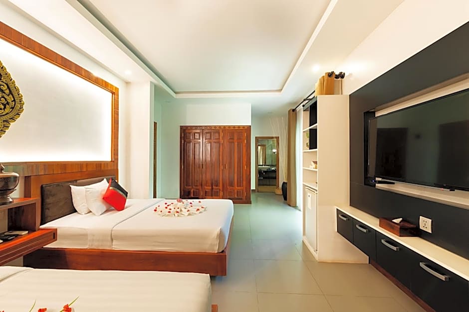 Peak Elite Boutique is a stylish 4-star retreat in Siem Reap, where a modern design meets relaxed comfort. The on-site Café Restaurant serves Cambodian, Asian, and European cuisines in a contemporary setting. The outdoors feature includes an outdoor pool (free) and a separate kids’ pool, with free private parking and free Wi‑Fi keeping everything easy. Inside, guests will find air conditioning, a bar, a sun deck, a terrace, garden views, a balcony, a bathtub, free toiletries, and non-smoking rooms that contribute to a comfortable stay.
