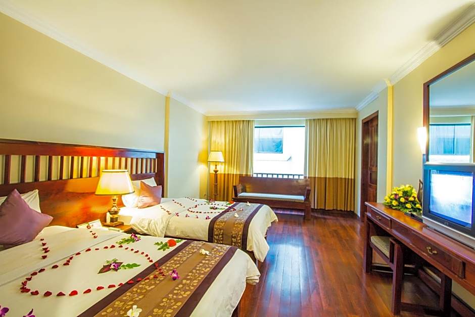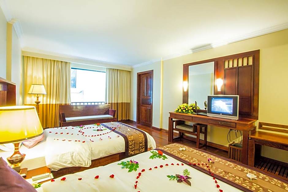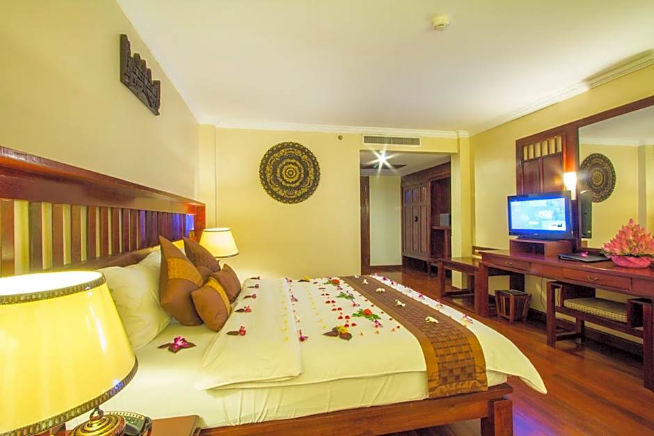 Address: National Road 6 (Airport Road), Phum Krous, Sangkat Svay Dangkum, Siem Reap Province, Angkor Camboda. Located in Siem Reap along National Road 6, this hotel combines convenient access with on-site leisure and dining options. Featured amenities include Spa/Wellness packages, Restaurant, Outdoor swimming pool (free), Kids' pool (free), Private Parking (free), Wifi (free), Room service, Fitness center (free), Terrace, Garden view, Landmark view, 24-hour front desk, and more.
