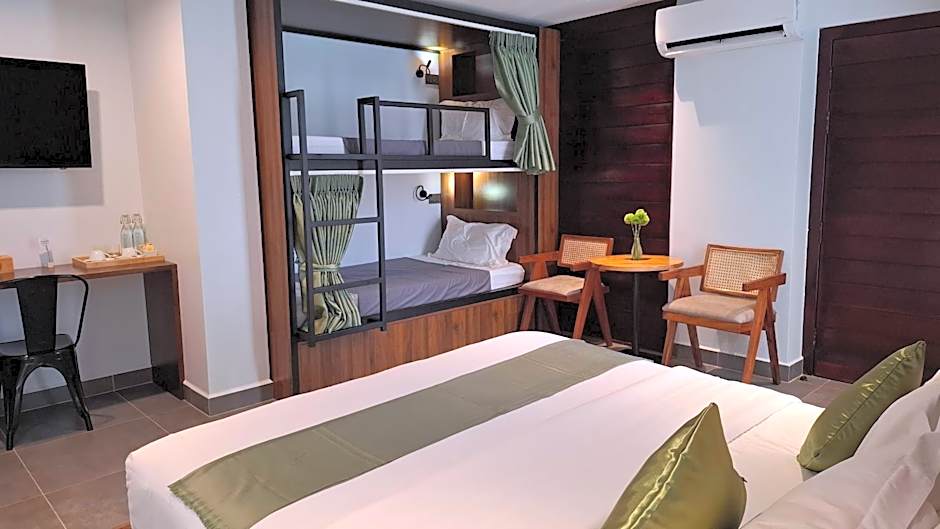 At Sok Hotel And Coffee Siem Reap, you'll find a range of room types to choose from, each designed to cater to your specific needs. The Suite with Terrace offers a spacious 377 sqft room, perfect for a couple seeking a little extra luxury. The Superior Double Room provides a comfortable 291 sqft space with a queen-size bed, ideal for two adults. Families or larger groups can opt for the Quadruple Room with Terrace or the Deluxe Quadruple Room, each accommodating four adults with the convenience of bunk beds and a queen-size bed. And if you're traveling with two friends or family members, the Deluxe Triple Room offers a twin bed and queen-size bed in a cozy 258 sqft room.