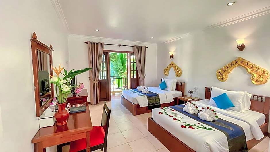 Dive into relaxation at the outdoor swimming pool or unwind with a soothing massage at the on-site spa (for an extra charge). Villa Indochine d'Angkor offers an array of amenities to make your stay as comfortable as possible, including free WiFi, air conditioning, a restaurant, and even a bar for those evening cocktails. And if you're up for an adventure, the hotel features a tour desk that can help you navigate the must-see spots around Siem Reap!