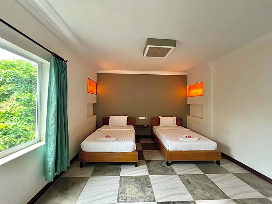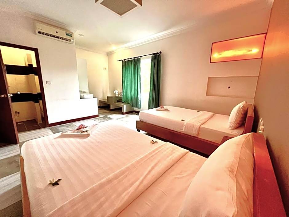 Villa Um Theara offers a variety of rooms including Superior Double Rooms with 1 Queen size bed, Classic Twin Rooms with 2 Twin beds, Deluxe Twin Rooms with 2 Twin beds, Superior Triple Rooms with 3 Twin beds, and Family Rooms with 2 Queen size beds. All rooms are non-smoking and accommodate either 2 adults and 1 child or 4 adults and 1 child. Room sizes range from 258 sqft to 323 sqft.