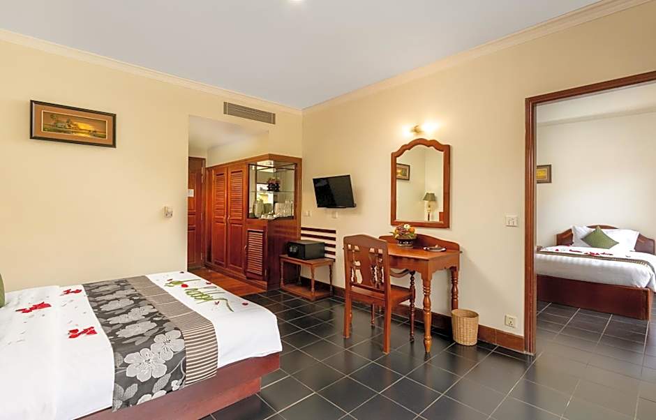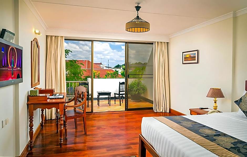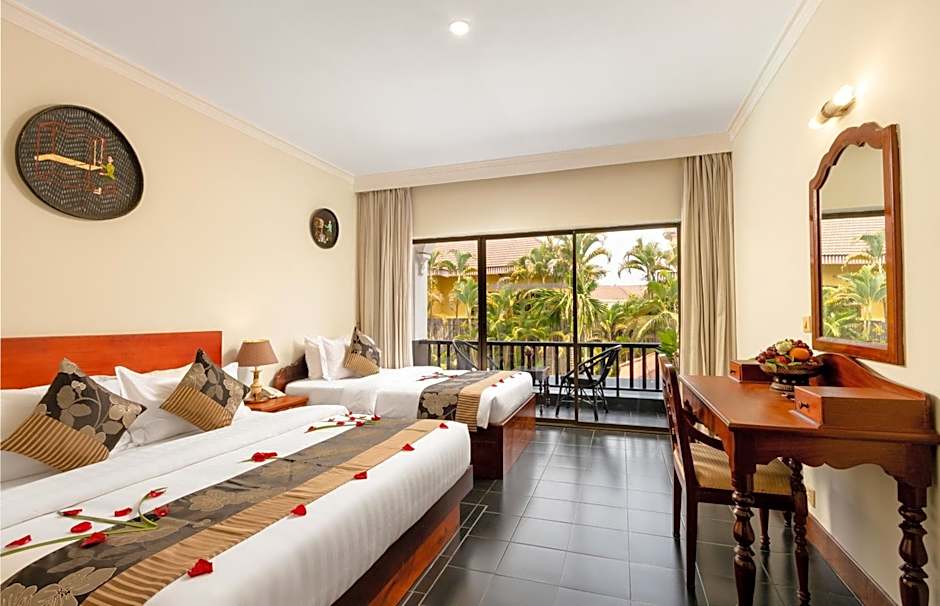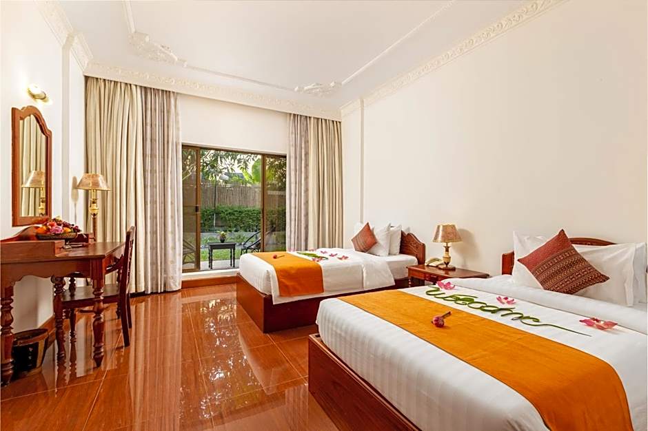 Dining is abundant at Restaurant #1, a versatile on-site spot with vibes ranging from family-friendly to traditional, modern, and romantic. The menu showcases American, Cambodian, Local, Asian, International, and European cuisines, making it easy to find something tasty at any hour. The outdoor pool is complimentary and features a shallow end, perfect for a relaxed dip after temple-hopping. Garden spaces with a sun deck, beach umbrellas, and beach chairs round out the laid-back, traveler-friendly vibe.