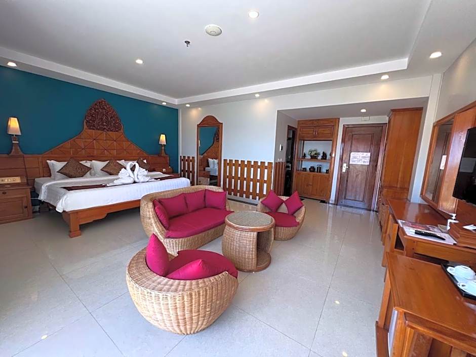 The hotel offers various types of rooms including King Rooms with Sea View, Superior Suites, Deluxe Twin Rooms, Deluxe Family Suites, Junior Suites, Superior Twin Rooms, Deluxe Family Rooms, Superior Triple Rooms, and King Rooms with Pool View. These rooms can accommodate either 2 adults and 1 child or 4 adults and 1 child, depending on the room type. All rooms are non-smoking and have different bed sizes ranging from King size beds to Twin beds.