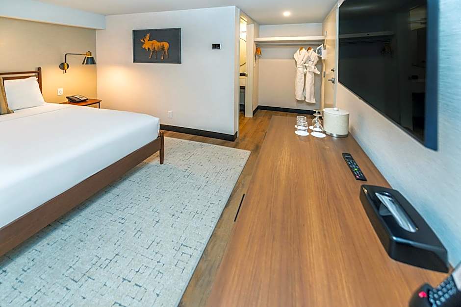 The hotel offers a variety of rooms including Deluxe Rooms with Queen or King beds, Deluxe Rooms with Two Queen Beds, King Loft with Fireplace, Deluxe Mountain View Two Queen Beds, Kitchenette Suite, and Deluxe Mountain View One King Bed. All rooms have a non-smoking policy and offer different bed and room sizes to accommodate varying numbers of adults and children. The room sizes range from 172 sqft to 355 sqft.