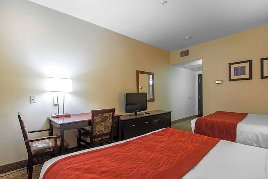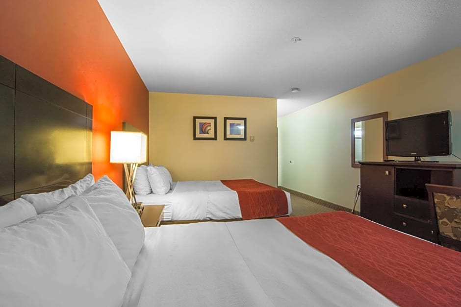 The Comfort Inn & Suites Airport South offers a variety of room types including Double Queen Rooms, King Rooms with Spa Bath, King Suites, Queen Suites with Sofa Bed, and Standard Queen Rooms with Two Queen Beds. All rooms are non-smoking and have a room size of 205-215 sqft. The occupancy ranges from 2 adults and 1 child to 4 adults and 3 children, depending on the room type. The bed sizes in the rooms include 2 Queen beds, 1 King bed, and a combination of a Queen bed and a Sofa bed.