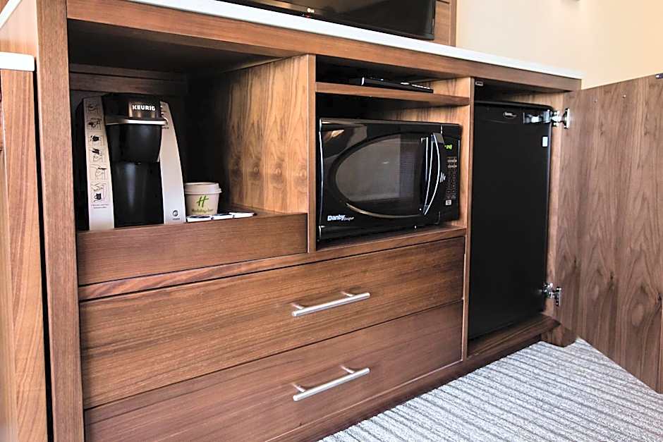 This room features features a 48-inch flat-screen TV and a work desk with an ergonomic chair. A microwave, refrigerator and a Keurig® coffeemaker are also provided.