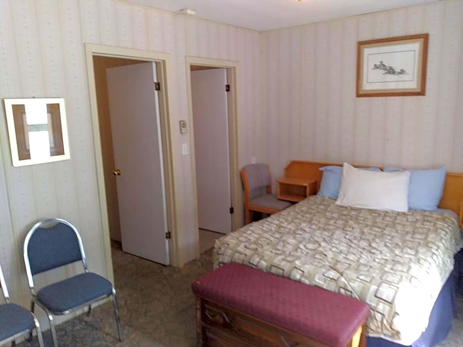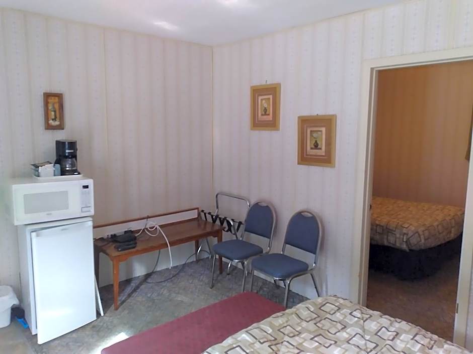 This room is located at ground level with parking directly in front of the room. It provides one separate bedroom, with a double bed. This room has cable TV, a large wall-mounted fan, a kitchenette and a small fridge and a coffee maker. The kitchenette provides both eating and cooking utensils. The bathroom has a shower. This room is dated and worn, but clean.