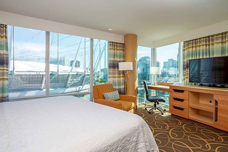 The Hampton Inn & Suites, by Hilton - Vancouver Downtown offers a variety of room types. These include the King Suite with Kitchenette, which can accommodate up to 4 adults and 3 children and features a King size bed and a sofa bed. The Queen Room with Two Queen Beds can also accommodate 4 adults and 3 children and offers two Queen size beds. There are also Double rooms available, including the King Room with Shower Only, the King Room with Disability Access, and the Standard King Room, all of which can accommodate 2 adults and 1 child and feature a King size bed. Smoking is not allowed in any of these rooms.