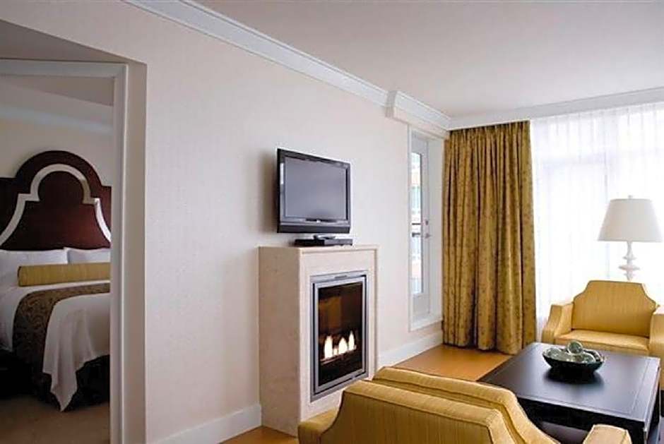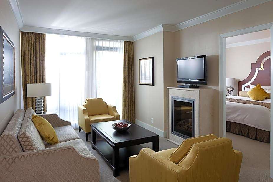 This suite features one bedroom with a king sized bed, separate living room with fold-out double sofa bed, and a 4-piece marble bathroom. It offers a cozy fireplace, free Nespresso coffee, and a 48" LED smart HDTV with digital satellite, featuring 299 TV channels. Free WiFi is provided.