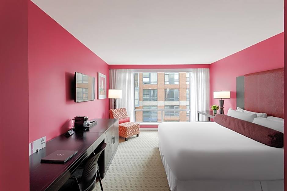 This standard king room features floor to ceiling windows, business desk, walk-in shower and deluxe sofa chair.