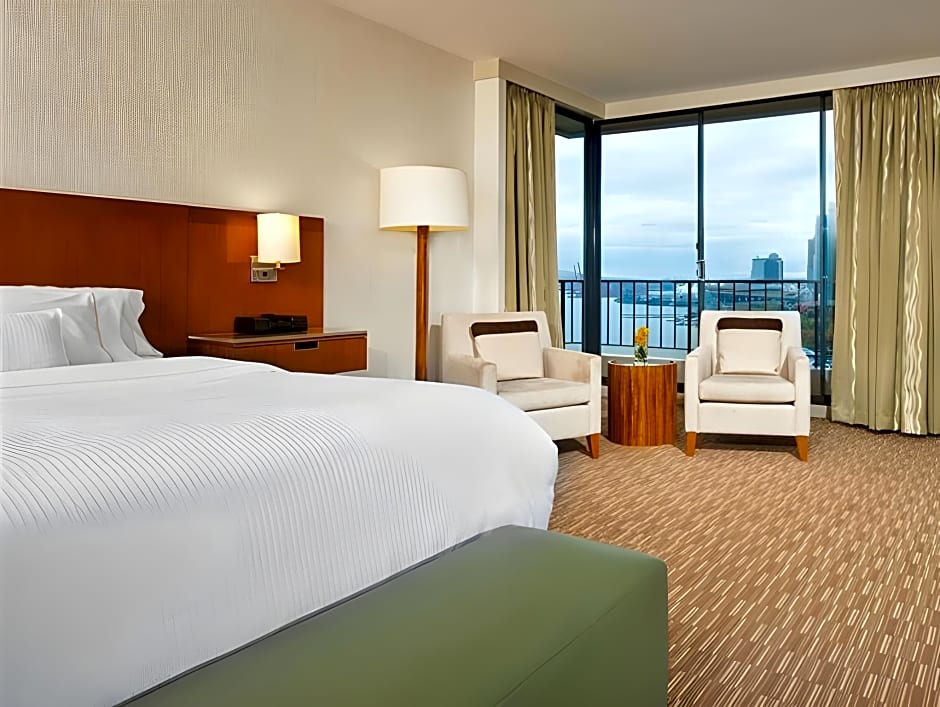 Premium Room, 1 King Bed, Non Smoking, Marina View is 312 square feet and includes a king-size bed 150-183 width plus balcony, extra beds on demand, desk, hairdryer, tea and coffee making facilities , ironing set, safe, and bathrobes.