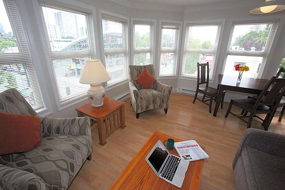 Also known as "Corner 1 Bedroom & Den," this corner suite overlooking Robson St and Denman, offers 1 bedroom and a second smaller bedroom with a stand up balcony. A full kitchen and a living room with a cable TV and a sofa bed are provided. Laundry facilities are included. Free WiFi and telephone calls within Canada and the US are provided.