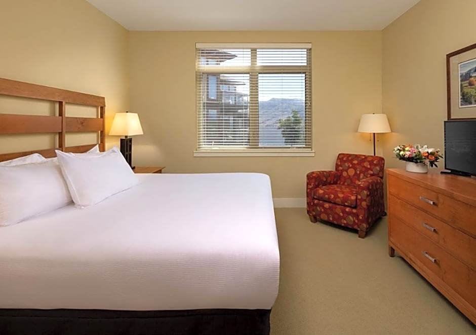 Each one bedroom Mountain view suite contains a king bed in the master bedroom, comfortable living area with Optik TV, dining area, as well as a fully equipped 5 piece Gourmet Kitchen complete with wine fridge, full bath and private balcony overlooking the beautiful Okanagan valley/ mountains.