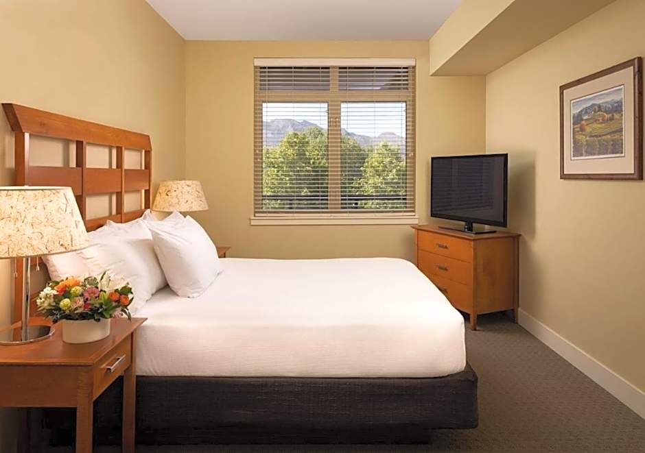 Each two bedroom Mountain view suite contains a king bed in the master bedroom, either one queen in the second bedroom, spacious living room with Optik TV, as well as a fully equipped 5 piece Gourmet Kitchen complete with wine fridge, 2 full baths and private balcony overlooking the beautiful Valley view or Okanagan mountains.