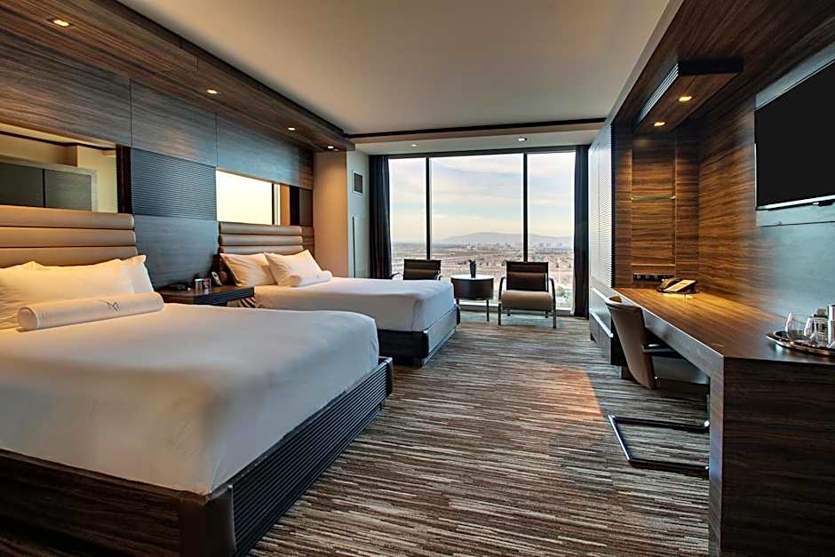 The hotel offers King Rooms, Queen Rooms with Two Queen Beds, One-Bedroom King Suites, and King Studio Suites. All rooms are non-smoking and range in size from 312 to 334 square feet. The King Rooms and Suites accommodate 2 adults and 1 child, while the Queen Rooms accommodate 4 adults and 3 children. All King Rooms and Suites have 1 King size bed, while the Queen Rooms have 2 Queen size beds.