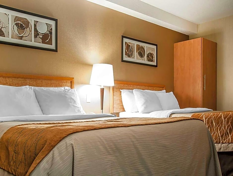 The Comfort Inn Fredericton offers a variety of room types including double rooms with two double beds on the ground floor and second floor, standard king rooms, and standard queen rooms on the second floor. All rooms are non-smoking and have a similar size of 237-248 sqft. The rooms can accommodate between 2 and 4 adults, with additional space for children. The beds provided are either double or queen size.