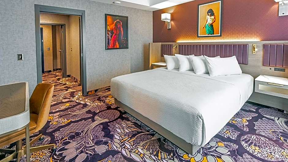 Offering a spacious room with a King Bed and pull out sofa bed, this stylishly furnished room offers free WiFi and a 42" flat-screen LED TV with cable channels. A mini fridge, in-room safe, and a Keurig coffee machine with complimentary Starbucks coffee and tea is provided. The radios are Bluetooth compatible. Guests will find a hairdryer, bathrobes and toiletries in the bathroom.