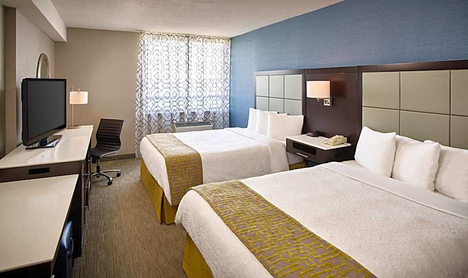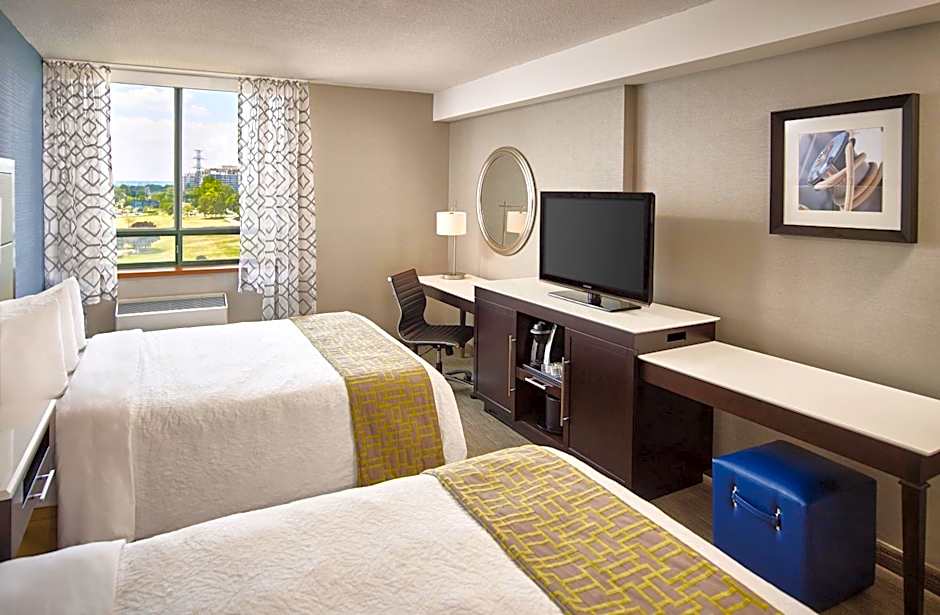 This spacious guestroom features two queen pillow-top beds with fresh linens and white duvets. Amenities include a mini- fridge, microwave, Keurig pod coffee and tea brewer, a 40” flat-screen TV, and a well-lit work area with free WiFi. Guest bathrooms feature modern white quartz countertops, plush towels, stylish flooring and upscale Nest bath & body amenities.