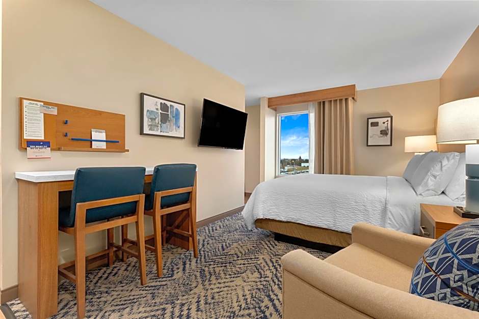Because we were in an accessible room, the bed was very low, and slid around a lot on the floor, so sitting on the bed was difficult. We would suggest putting something on the corners of the bed to avoid this. Also, there was only one chair, so one of us always had to sit on the bed. Another chair would have been helpful. We had a small dog with us, so we were in a room beside another family with a dog. They went out at night and left the dog to bark constantly until 2:30 a.m. I called the front desk, the customer was called and returned to the room and the dog quieted down, however, we didn’t sleep much that night. Dogs should not be left alone in the rooms.