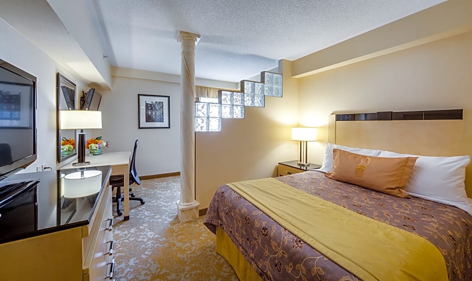 The Monte Carlo Inn & Suites Downtown Markham offers a variety of room types, including standard rooms with 1 king bed or 1 queen bed, deluxe king suites with a jetted tub and living room, luxury king suites with a jetted tub, queen suites with a sofa bed, and king suites with a jetted tub. Smoking is not allowed in any of the rooms. The rooms can accommodate 2 adults and vary in size from 301 sqft to 538 sqft.