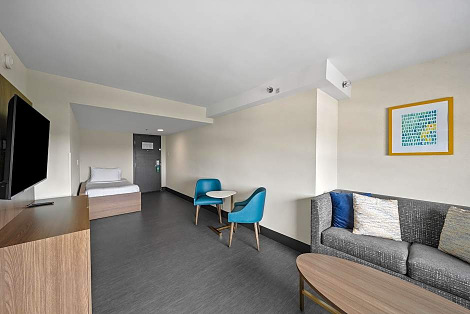 This suite features a microwave, refrigerator and separate living room with a sofa bed.