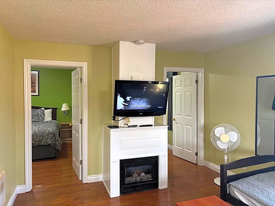 Excellent location on the main street of North Bay, ON right across from the lake. Suite had built in kitchenette with small fridge, microwave, toaster, coffee maker, kettle, dishes and sink. Handheld shower and bath were totally satisfactory, and the bed (in separate bedroom) was extremely comfortable and warm. Living room had queen-sized murphy bed and gas fireplace/stove under the TV so you could watch tv from murphy bed while enjoying the fire. Even though temperature dropped to -20C at night, the suite was toasty warm. All at a great price!
