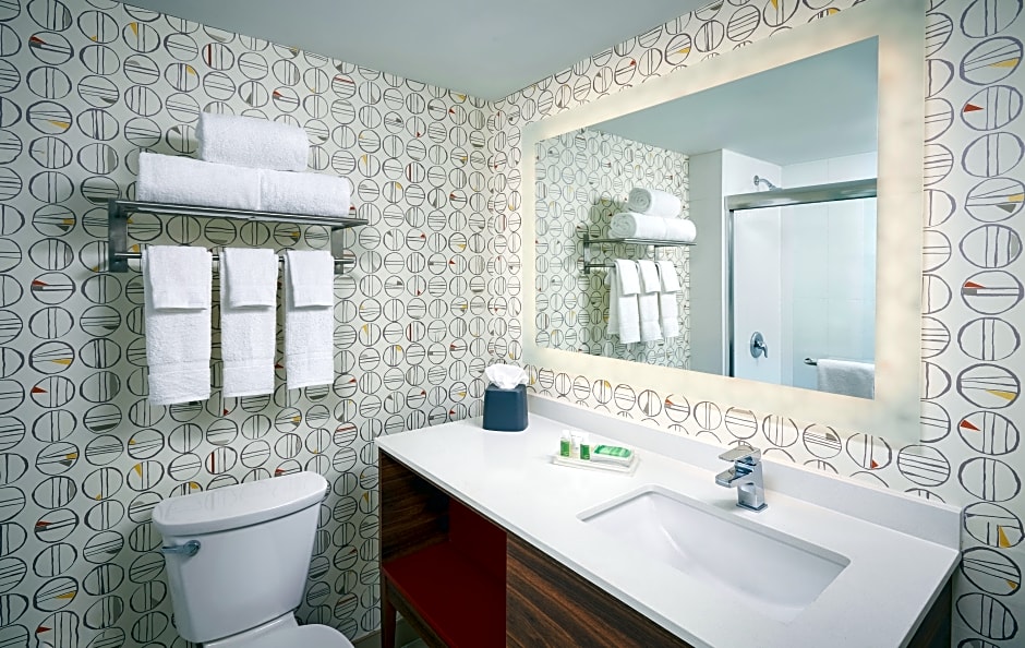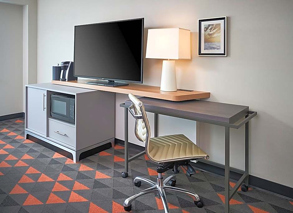 Contemporary, spacious and newly renovated corner suite One King bed Free Wi-Fi, 55” HDTV, mini-fridge, micro-wave, Keurig coffee maker, smart work area with rolling desk. Large Spacious Shower