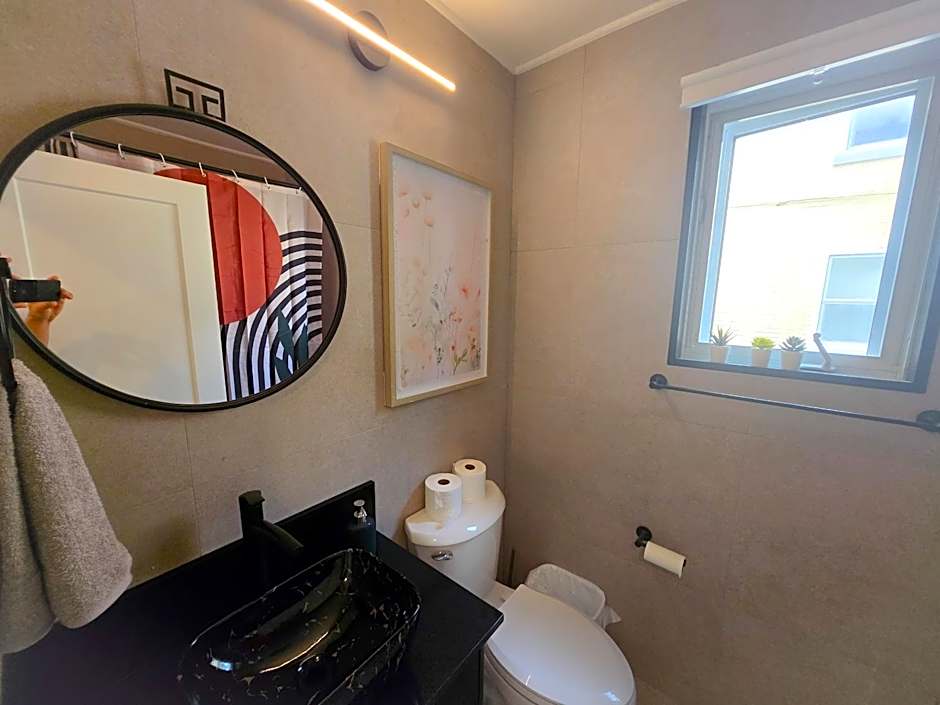 Just as pictured, modern and lots of space. Kitchen had everything needed to cook meals. Very comfortable and huge TV. A real treat! Host was prompt with responses to questions. Close to attractions. A great place to stay!