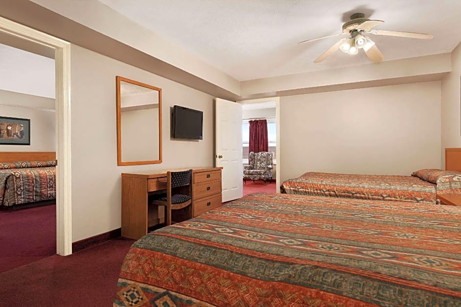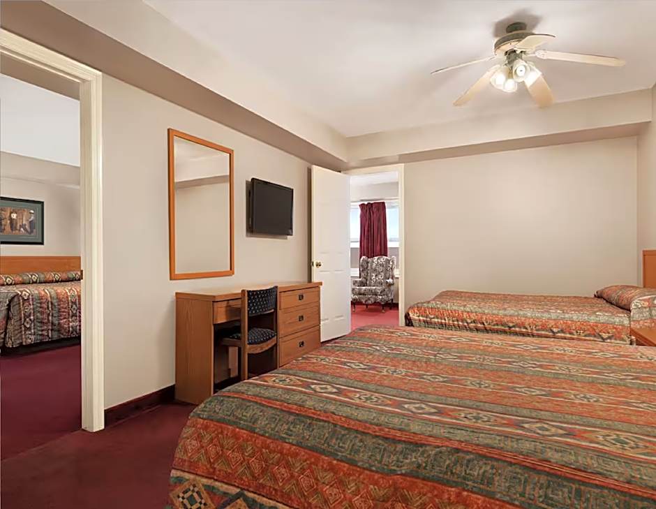 At Travelodge by Wyndham Port Elgin, the hotel offers a variety of room types including Queen Rooms with Two Queen Beds, King Rooms, Double Rooms with Two Double Beds, and Suites. All rooms are non-smoking and have exterior or hallway pool access. The rooms accommodate between 2 and 6 adults, with bed sizes ranging from Queen to King. The room size for all types is 205 sqft.