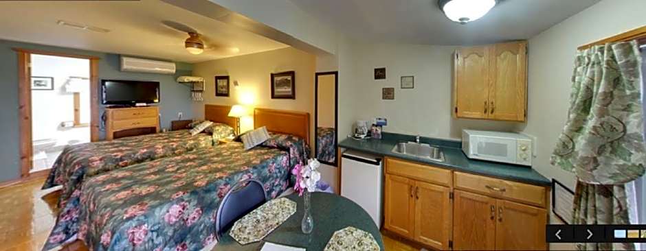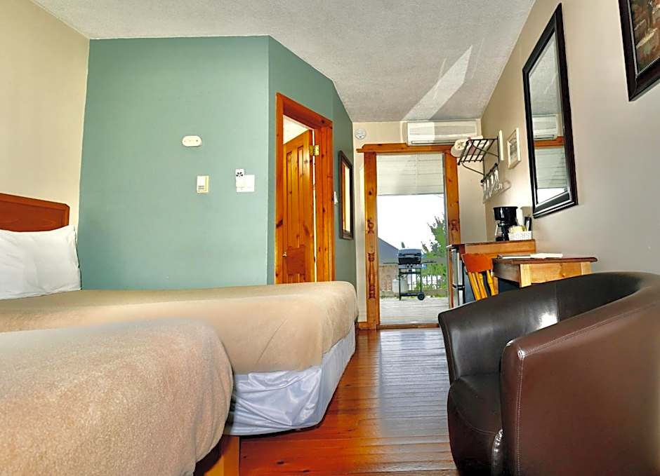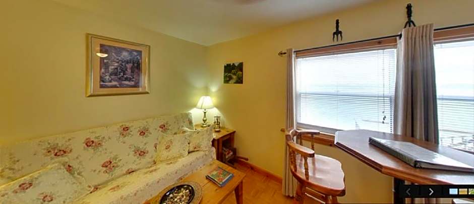 This suite contains a full kitchenette and small seating area. It has a front deck with river views.
