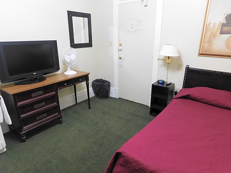 This simply furnished room includes cable TV and a sink. A toilet and shower, shared with other guests, is located just down the hall.