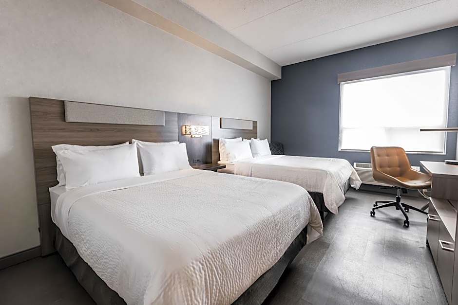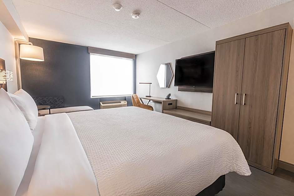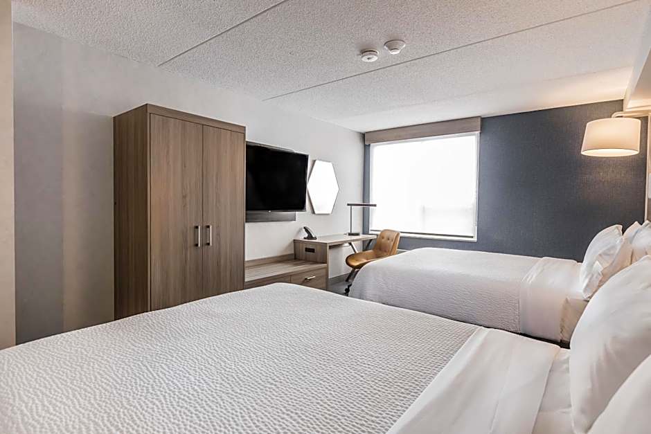 The Holiday Inn Express Toronto-North York offers a variety of room options. They have Corner Queen Rooms with a Queen size bed, Standard Queen Rooms with two Queen beds, Queen Rooms with two Queen beds on the ground floor, Standard Queen Rooms with a mobility accessible shower, Corner Queen Rooms with a sofa bed, Standard Queen Rooms with a sofa bed and mobility accessible shower, and Standard King Rooms with a Queen size bed and a sofa bed. None of the rooms allow smoking and the occupancy ranges from 2 adults and 1 child to 4 adults and 3 children.