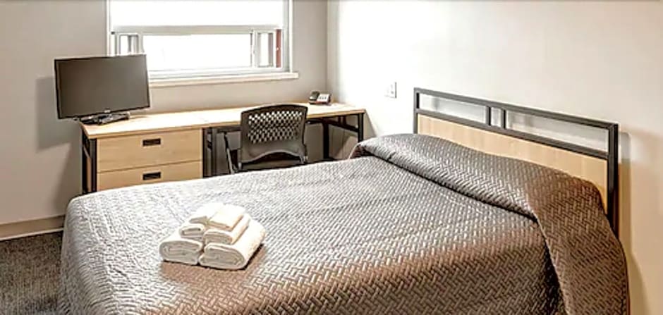 On college campus, apartment-style room, simple, spacious, kitchenette with microwave, sink, large fridge with a table and two chairs, tv in each bedroom, comfortable bed and pillows, good light-blocking blinds, large convenience store/mini grocery and Subway restaurant on premises