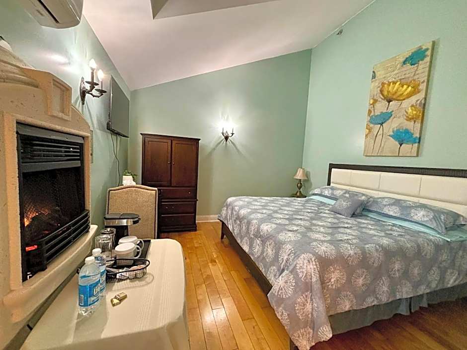 Located on the upper floor, this suite is equipped with a sleigh bed. It offers a hot tub and a seating area with a fireplace.