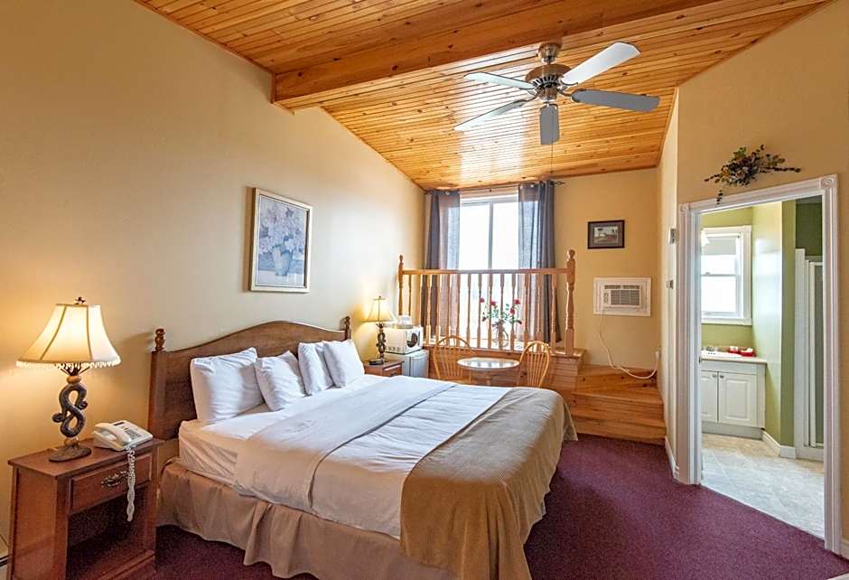 Cozy 3 bedroom Chalet with jetted tub, kitchenette and separate sleeping area. Non-Smoking. 1 Queen Bed in each of the 3 bedrooms and 2 Double Beds in the loft. Amenities include free WiFi, personal washer/dryer, private BBQ area, coffeemaker, patio, hairdryer, flat panel cable TV, DVD player, desk with lamp, table with chairs, sofa, clock radio, free local calls, and wake-up service.