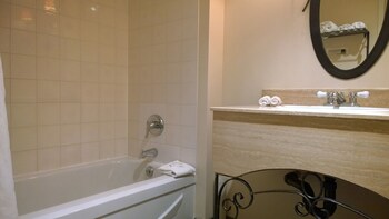 This suite features a work desk, living area with sofa bed and bathroom with glassed-in shower.