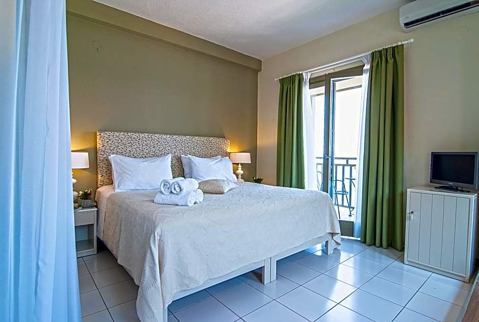 Spacious One-Bedroom Apartment with two double beds, accommodating 5 adults and 4 children. Enjoy the air conditioning, fully-equipped kitchen, and private balcony in this modern retreat.