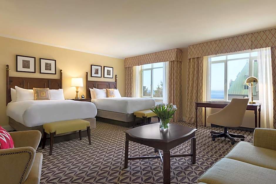 The Fairmont Le Manoir Richelieu hotel offers a variety of rooms, including Fairmont King Rooms, Fairmont Double Rooms with Two Double Beds, Deluxe Double Rooms with Two Double Beds, Fairmont Queen Rooms, Double Rooms with Two Double Beds with River View, Deluxe King Rooms, Fairmont King Rooms with River View, and Queen Rooms with River View. The rooms vary in size from 205 sqft to 248 sqft. All rooms are non-smoking and accommodate either 2 adults and 1 child or 4 adults and 3 children. The bed sizes range from Queen to King and some rooms offer river views.