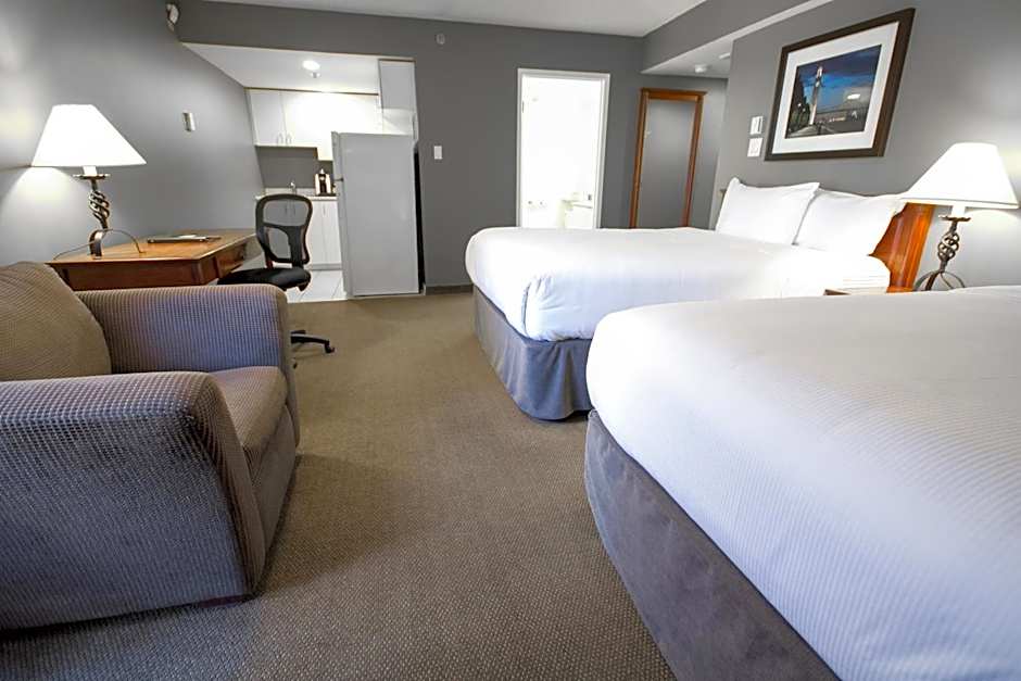 This suite has two separate bedrooms, each with 1 queen bed. The living room provides a sofa bed and kitchenette with a full size fridge and microwave.